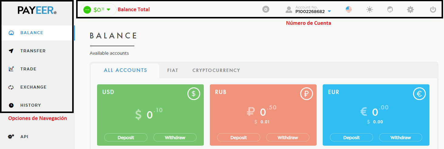 Cuando Inicies Sesión te encontraras con la pantalla principal de Payeer, allí podrás observar del lado izquierdo las principales opciones para moverte dentro de tu cuenta, en el centro tu balance y en la parte superior tu Número de cuenta y otras opciones de configuración.