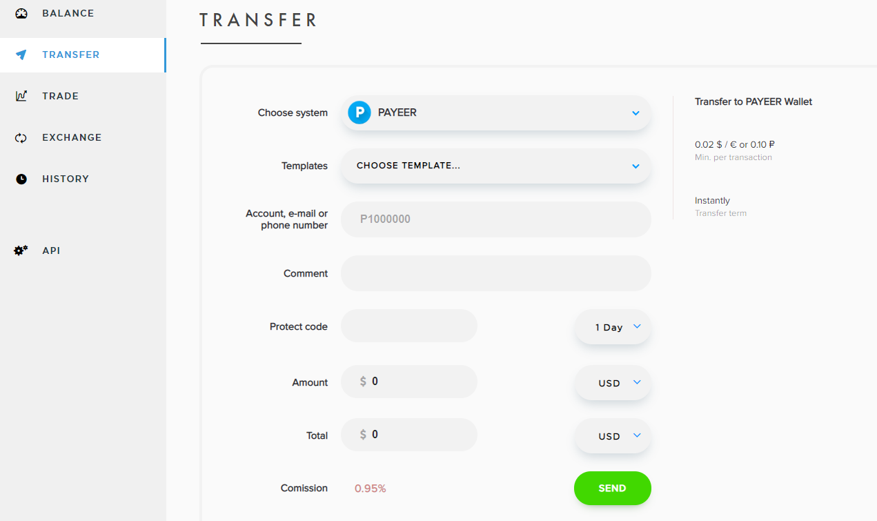 NOTA: Payeer cobrara el 0,95% de comisión por cada transferencia que realices. Por eso es importante que te asegures de tener suficiente saldo en tu balance para pagar la comisión.