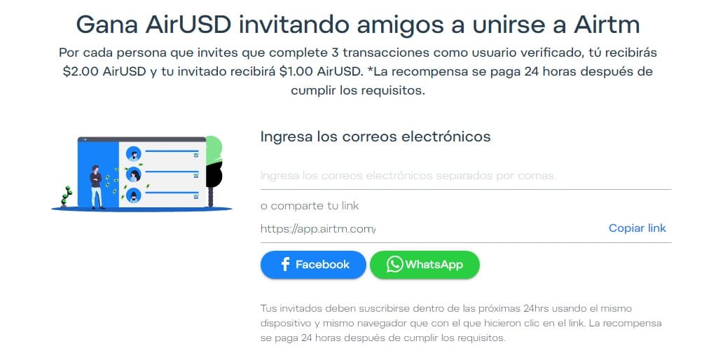 AIRTM cuenta con un sistema de referidos que te permite ganar 2 dólares por cada persona que invitas a registrarse a AIRTM, la persona que invitas debe crear una cuenta y activarla al 100% para que AIRTM deposite los 2 dólares a tu cuenta, hoy en día el sistema de ganancias a través de referidos es muy popular ya que hay grandes compañías como AMAZON que la utilizan para atraer nuevos registros a su plataforma.